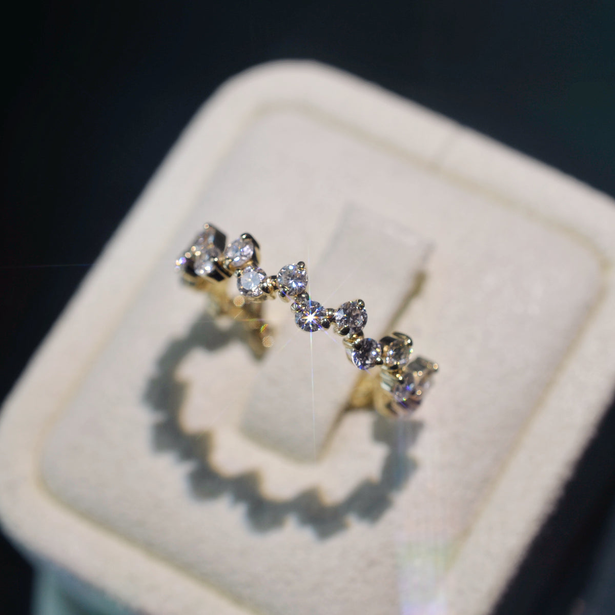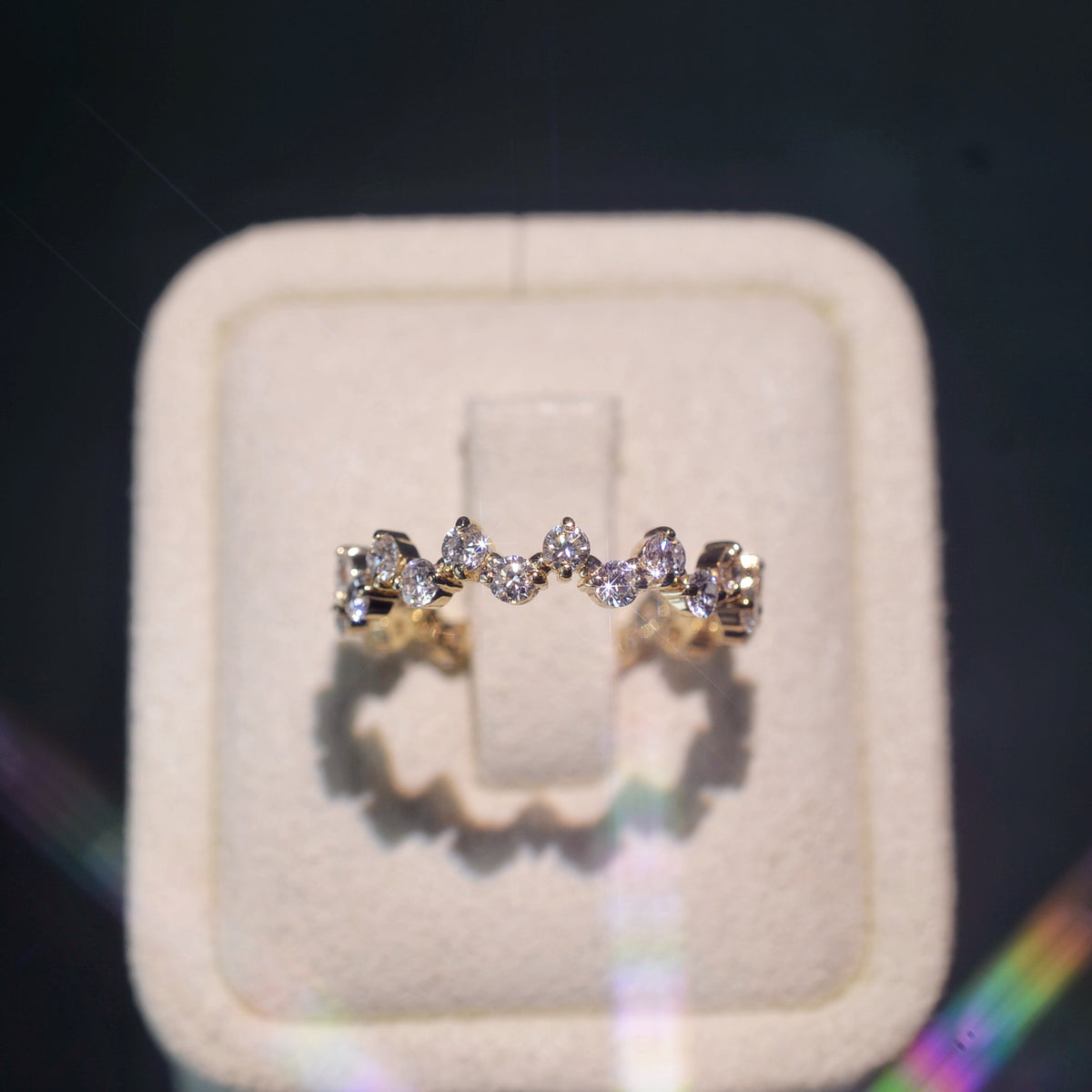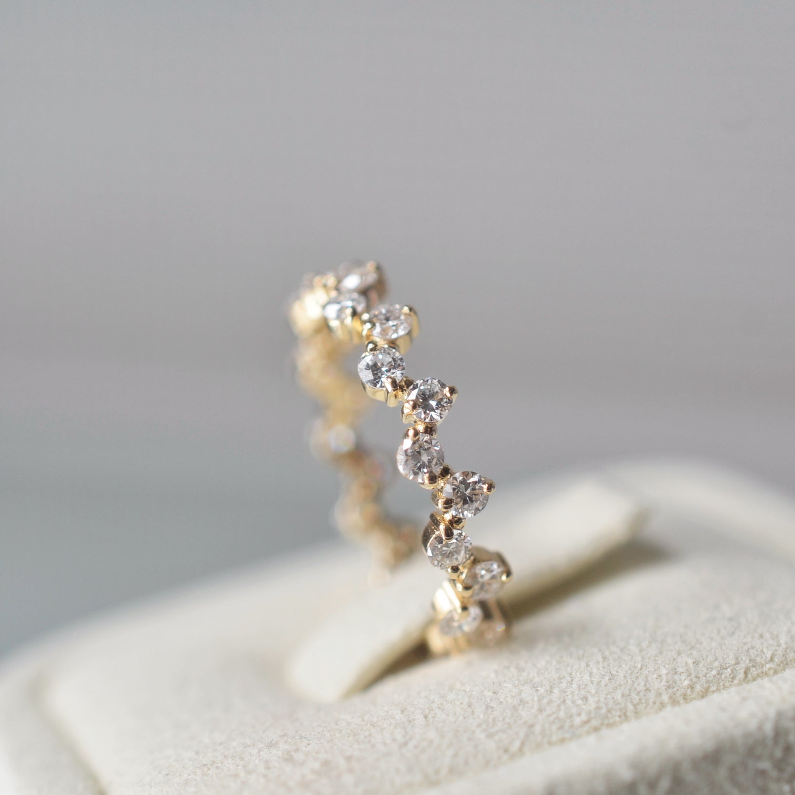 L’alliance Cascade dévoile un dessin ondoyant de diamants délicatement sertis, apportant une impression de fluidité et d’élégance.
