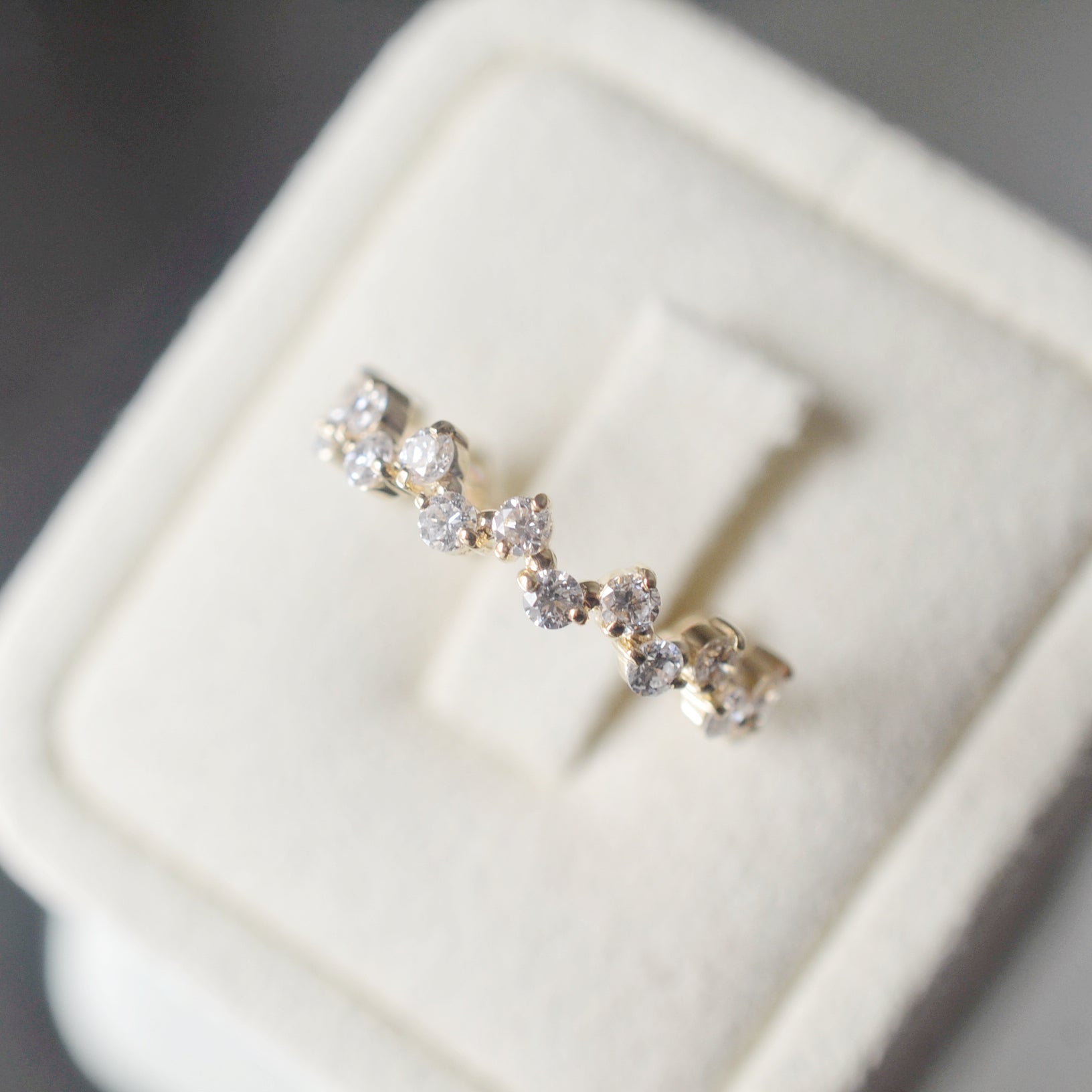 Cette bague superposée est sertie de vingt-six diamants taille ronde qui, disposés en cascade, captent la lumière sous tous les angles et dessinent une délicate vague lumineuse à l’éclat subtil et continu.
