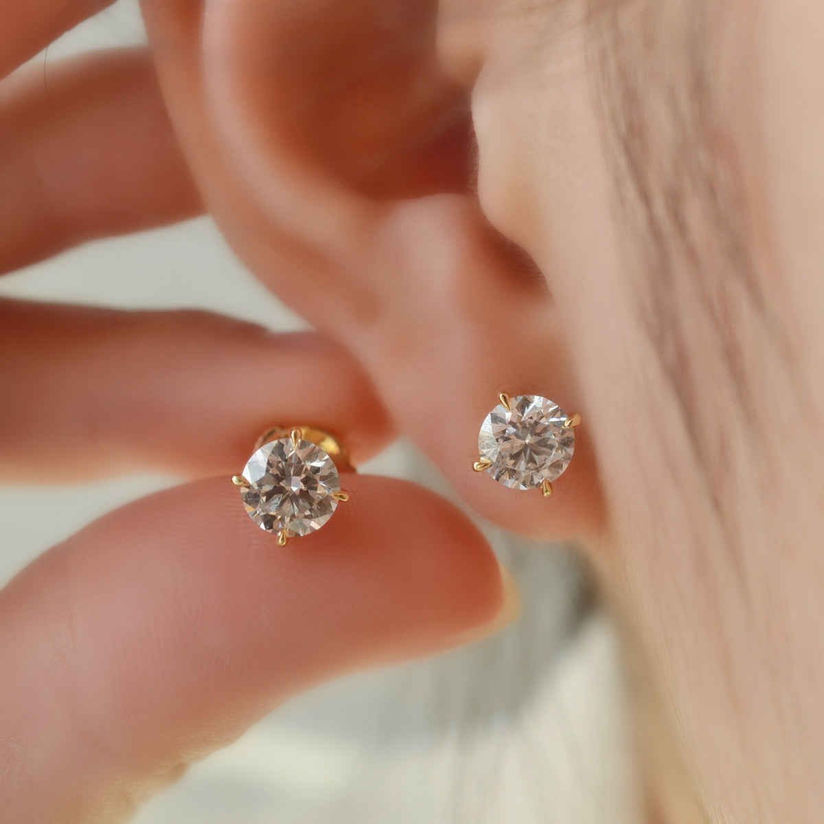 The Alya earrings showcase a 1-carat (2x) round lab-grown diamond, chosen for its fineness and delicate balance.